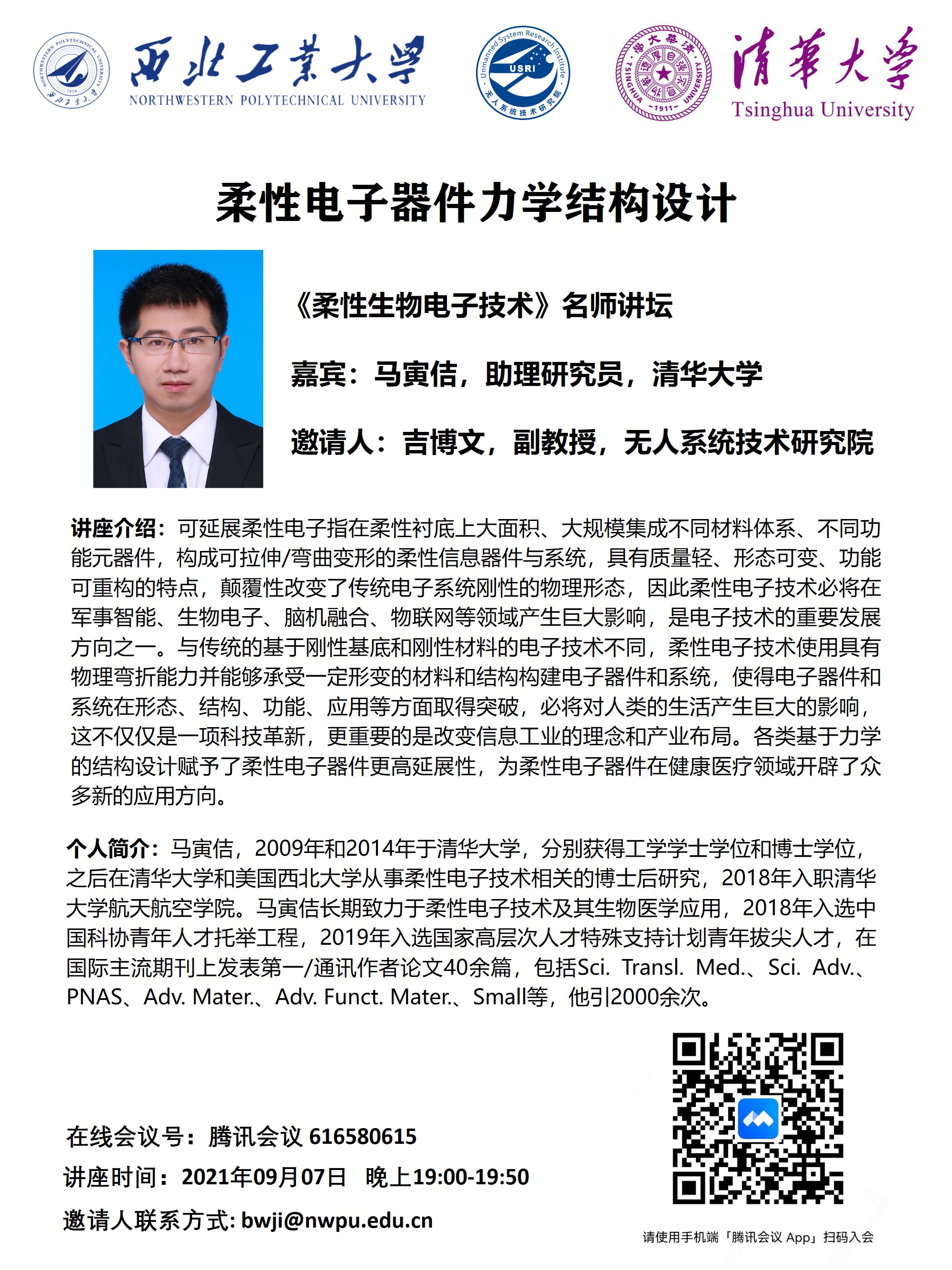无人系统技术研究院于9月7日-9月30日,线上举办《柔性生物电子技术》“名师讲坛”系列讲座。讲坛将邀请来自清华大学、北京大学、西北工业大学、大连理工大学、中国科学院空天信息创新研究院、浙江清华柔性电子技术研究院的6位柔性电子领域知名专家学者,聚焦柔性生物电子前沿技术,分享最新研究成果。